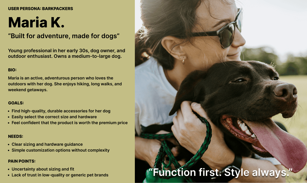 Through research and analysis, we gained a clear understanding of what users need when purchasing custom, handmade dog accessories online. It became evident that users wanted more than a typical e-commerce experience. They wanted clarity, trust, reassurance, and a premium, well-crafted experience that supports confident customization from product discovery to purchase.