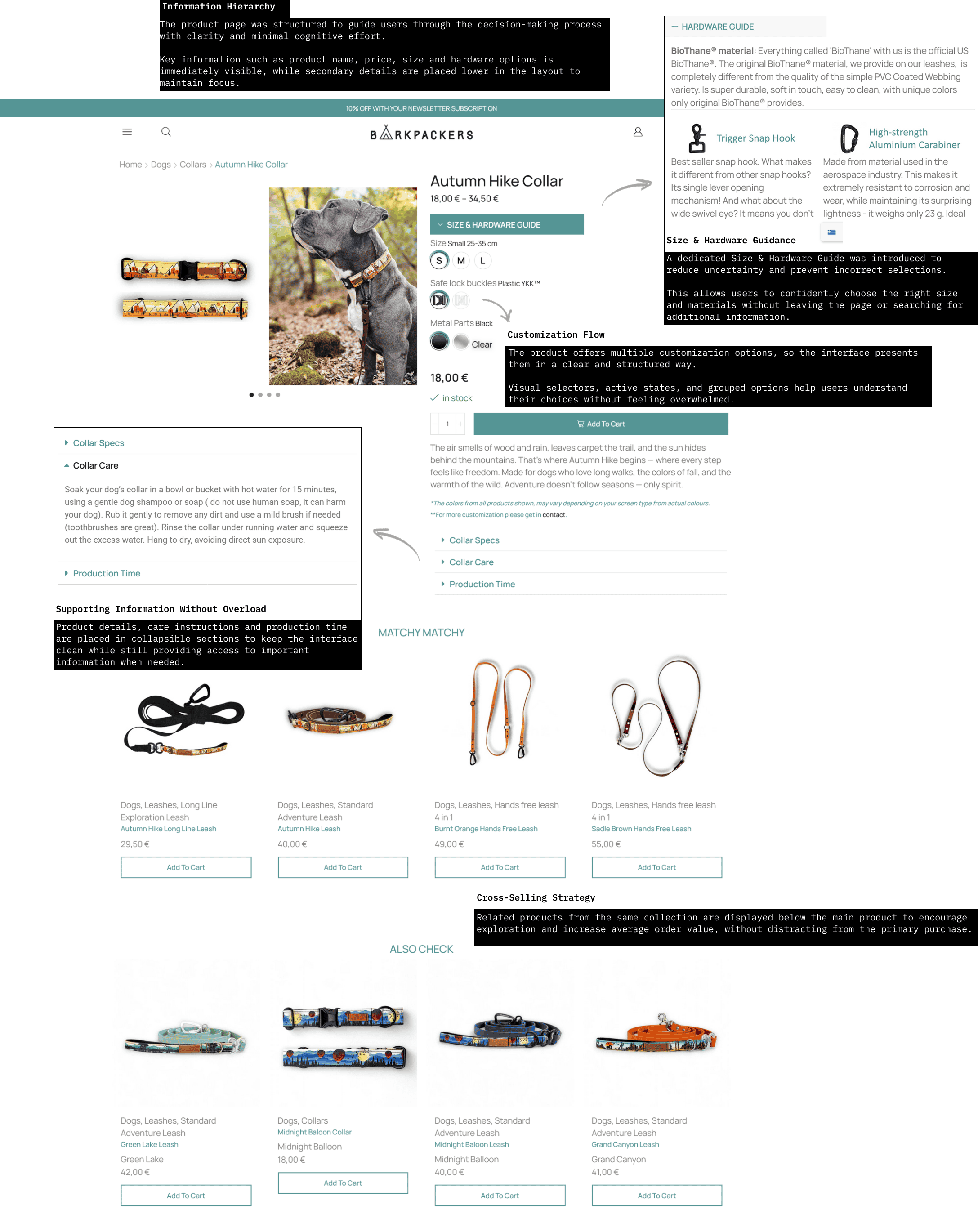 The goal of this project was to transform a complex, fully customizable handmade product into a clear and intuitive shopping experience. With a thoughtful information hierarchy, guided customization, and minimal visual design, the product page helps users understand their options, build trust, and make confident decisions. The final result strikes a balance between usability, aesthetics, and storytelling, thereby reinforcing Barkpackers premium, handcrafted identity.