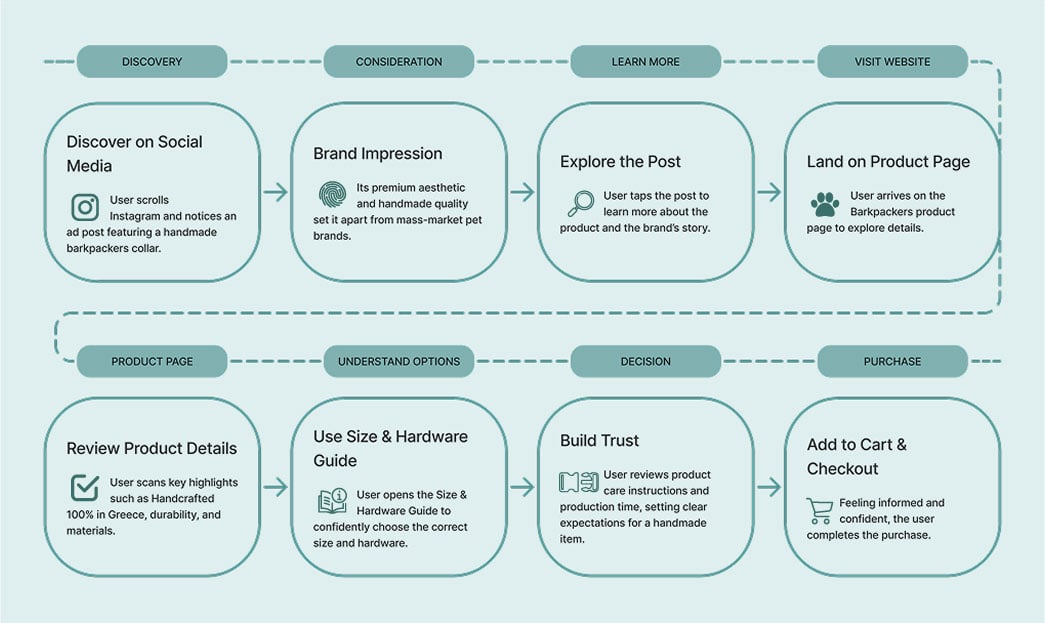This user case scenario maps out the journey of a first-time visitor who discovers Barkpackers on social media and navigates a custom product page. The scenario was used to identify key touchpoints, reduce friction during customization, and prioritize product page features that promote clarity, trust, and confident decision-making.