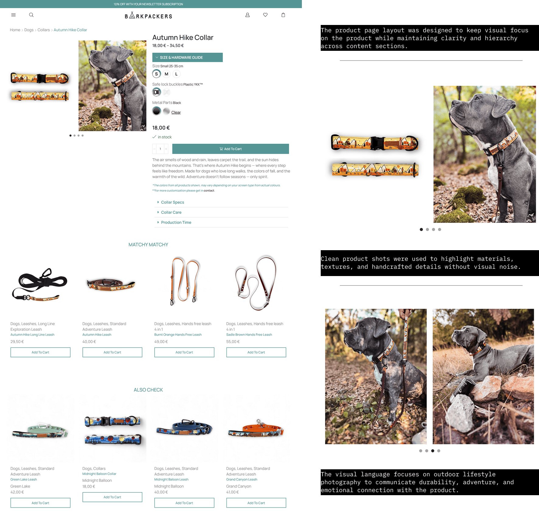 The goal of this project was to transform a complex, fully customizable handmade product into a clear and intuitive shopping experience. With a thoughtful information hierarchy, guided customization, and minimal visual design, the product page helps users understand their options, build trust, and make confident decisions. The final result strikes a balance between usability, aesthetics, and storytelling, thereby reinforcing Barkpackers premium, handcrafted identity.