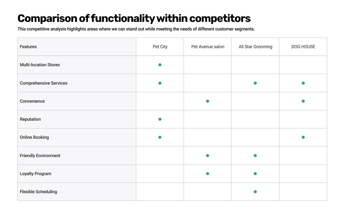 The competitive analysis highlights key insights from four major competitors in the pet grooming industry. Each competitor offers unique strengths such as convenience, personalised services and flexible scheduling. However, they also have weaknesses such as inconsistent service quality, limited personalisation and higher prices. By understanding these competitors, the pet grooming site can differentiate itself by focusing on offering affordable prices, a personalised customer experience and convenient mobile grooming options, while maintaining an easy-to-use online platform that addresses specific customer pain points.