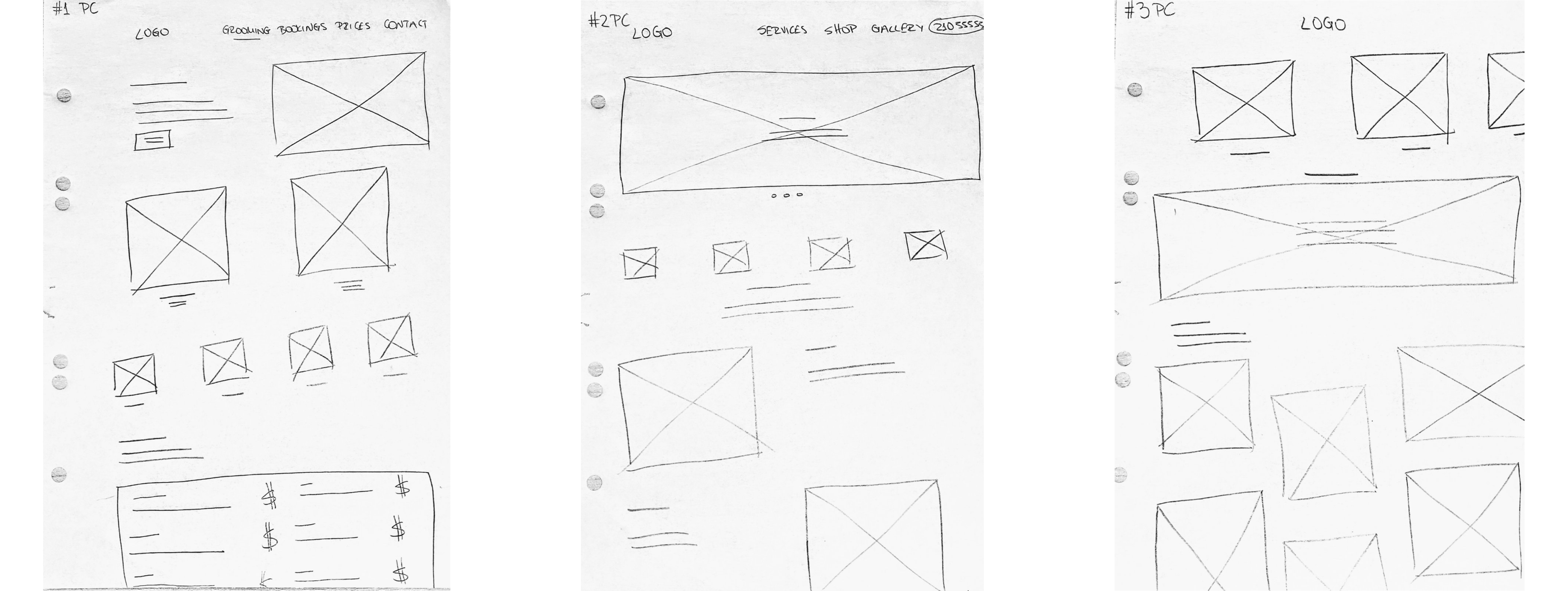 Quick sketches are a fundamental step in the design process, allowing you to quickly visualise ideas and layout options. These sketches provide a rough but effective blueprint for the structure and user flow of the pet grooming site. By focusing on the layout of key elements such as the online booking interface, service descriptions and pricing sections, the sketches help to refine the overall user experience at an early stage. This quick, iterative approach allows for quick adjustments based on feedback, ensuring that the final design is both user-centric and efficient.